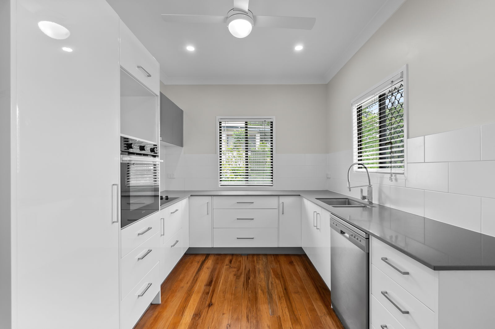 - Double sink, stone benches and dishwasher