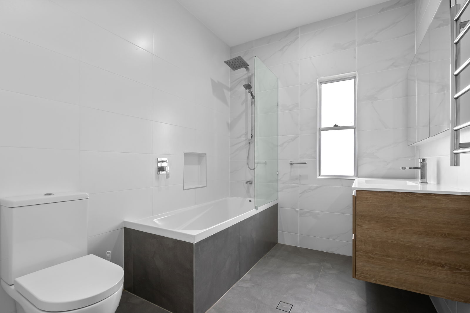 - Modern bathroom with shower over bath