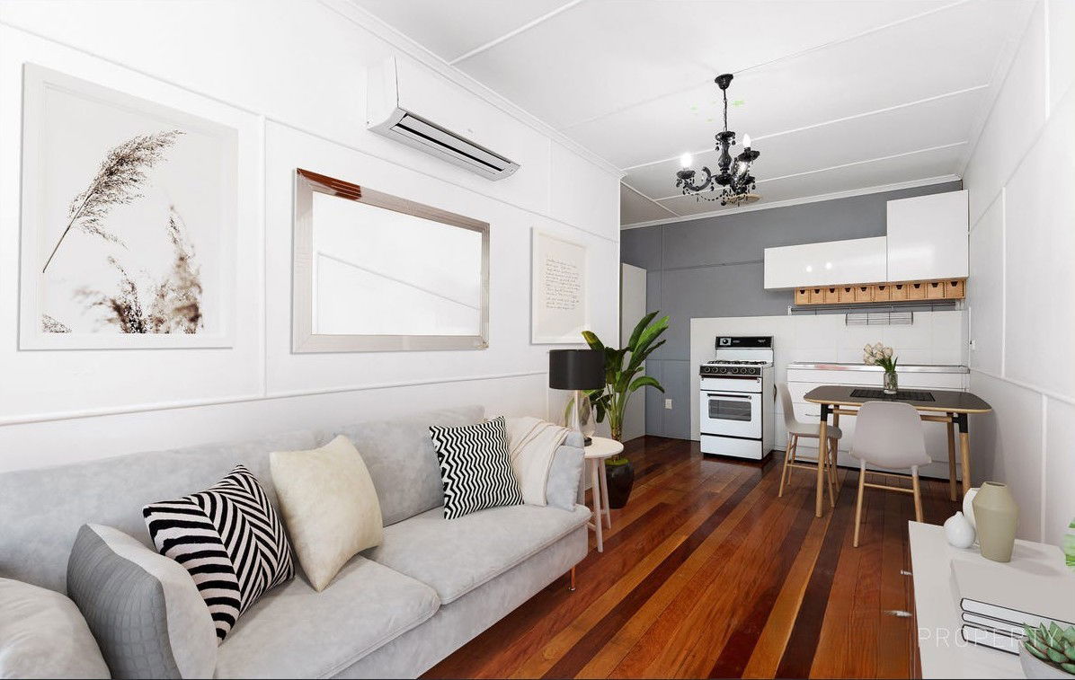 - Open plan kitchen and living with air conditioning