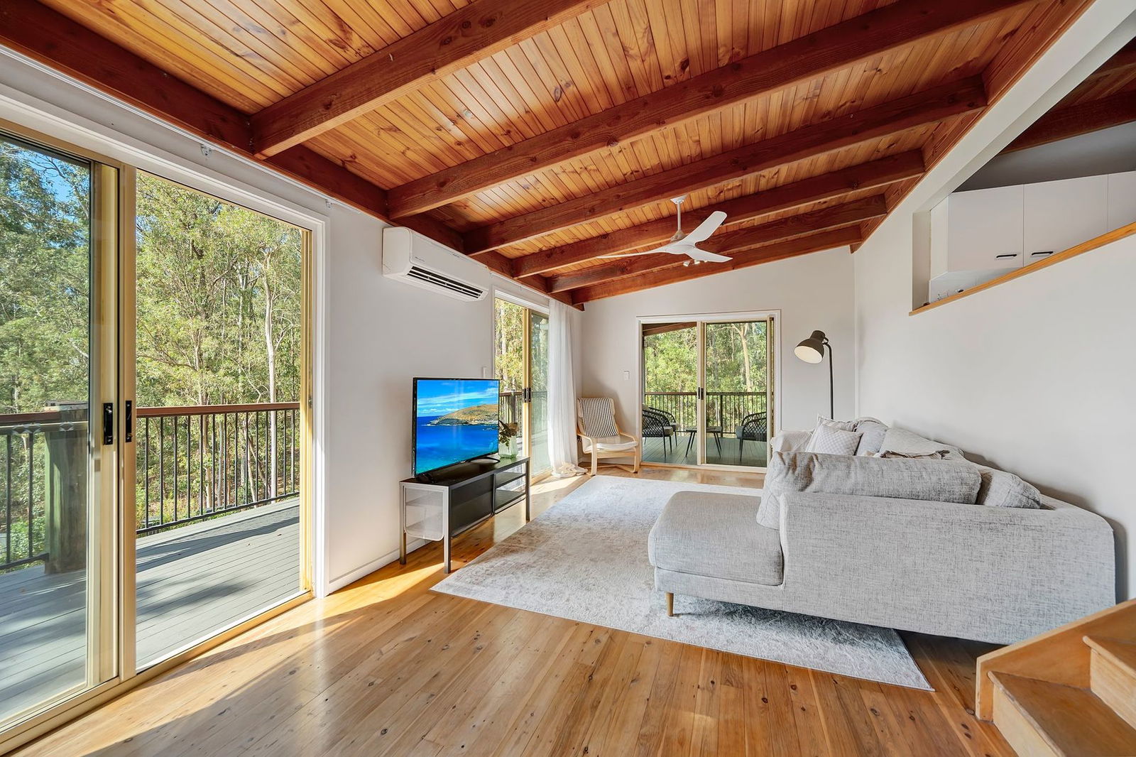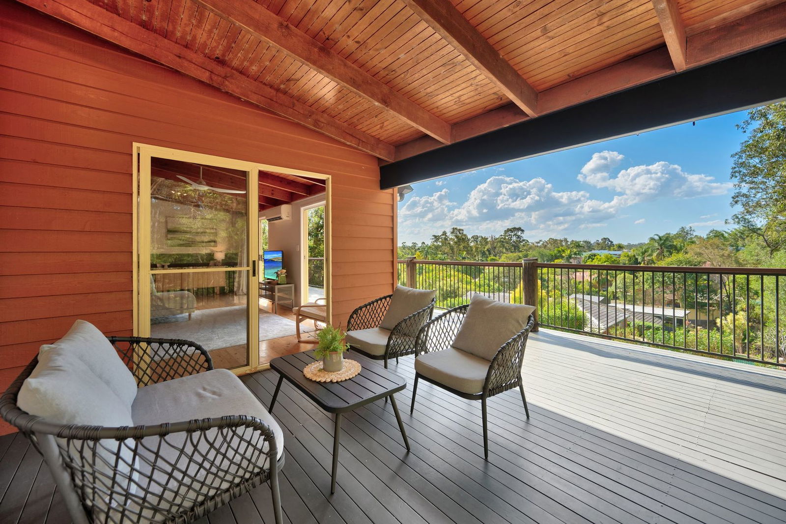 - Two separate living rooms with access to a wrap-around deck, one with air conditioning