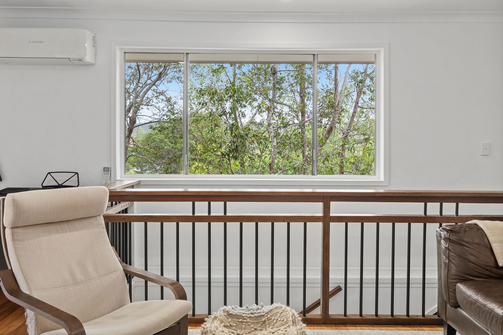 - Air-conditioned living area with abundant natural light and treetop views
