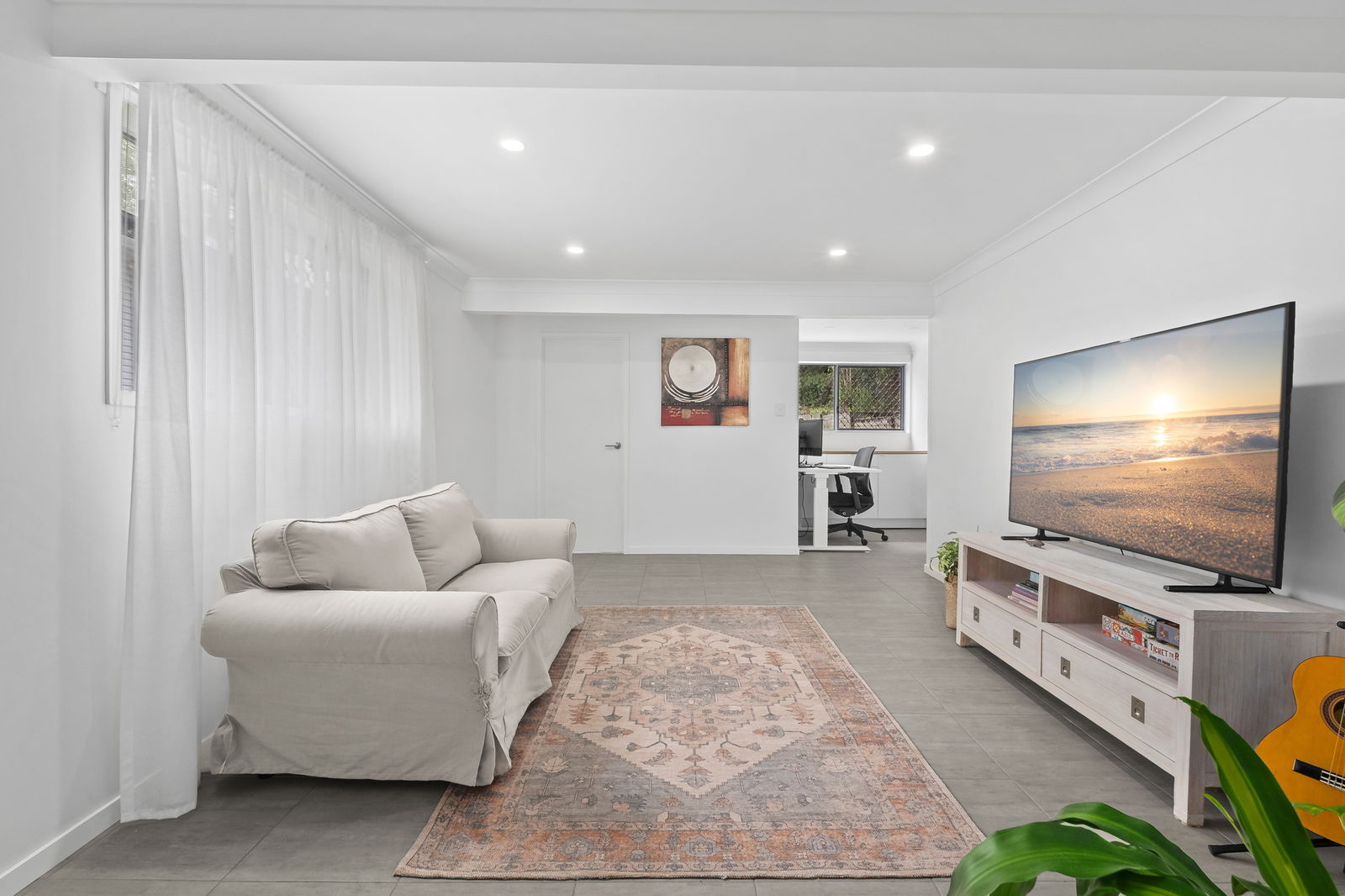 - Open-plan kitchen, dining and living with polished timber floors and shutters