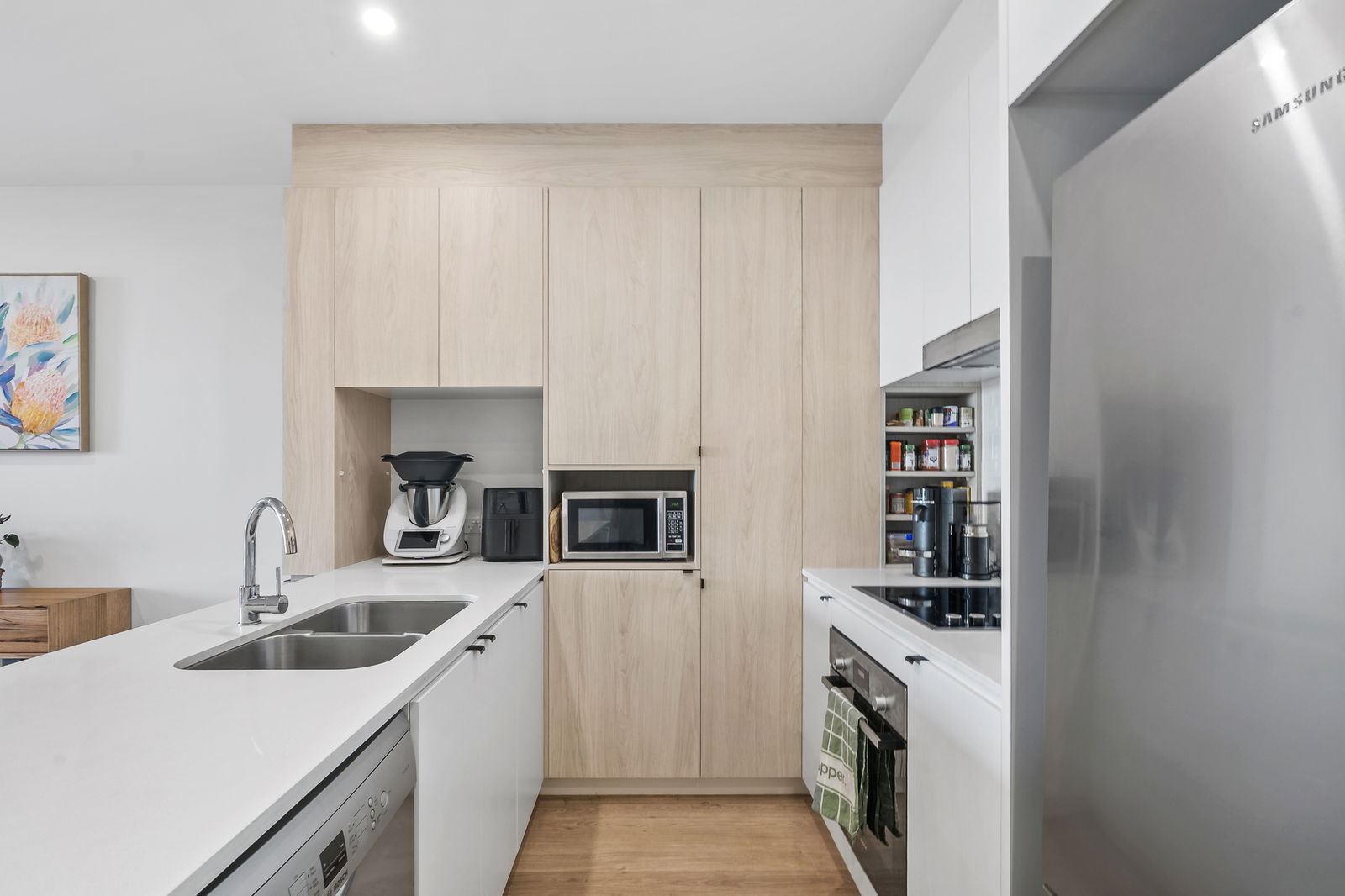 • Stylish contemporary kitchen with stone benchtops, premium finishes, quality appliances including electric cooktop, oven and dishwasher, fridge water connection, and feature splashback