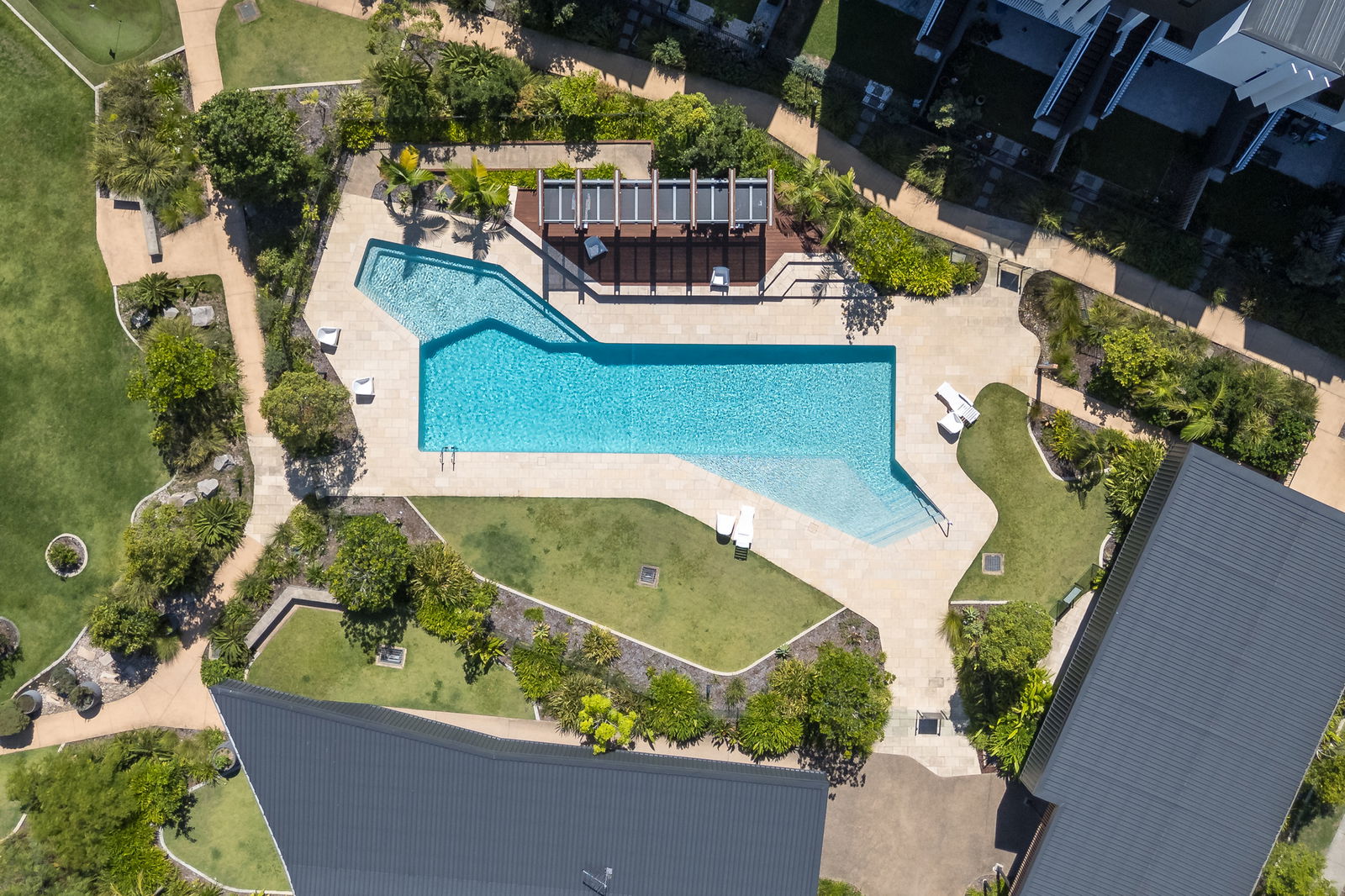 • Resort-style swimming pool framed by beautifully landscaped gardens