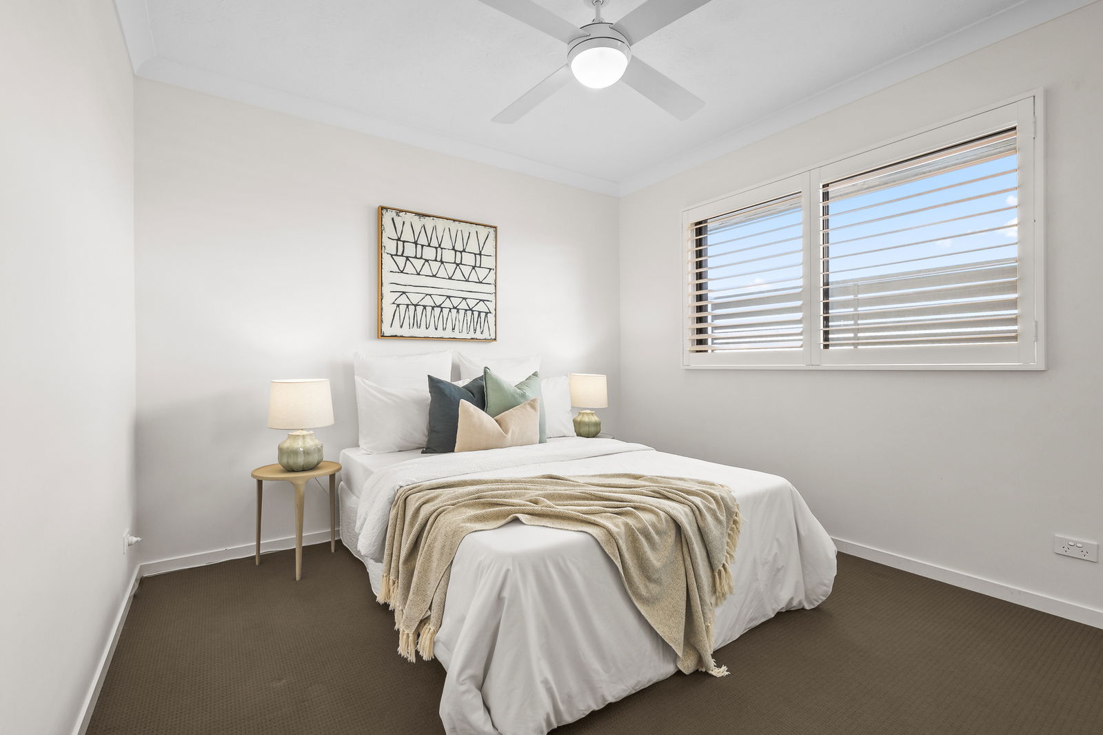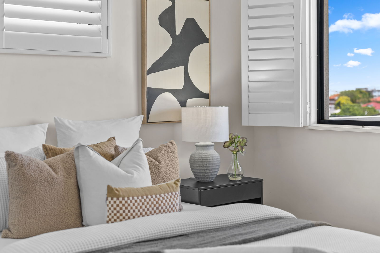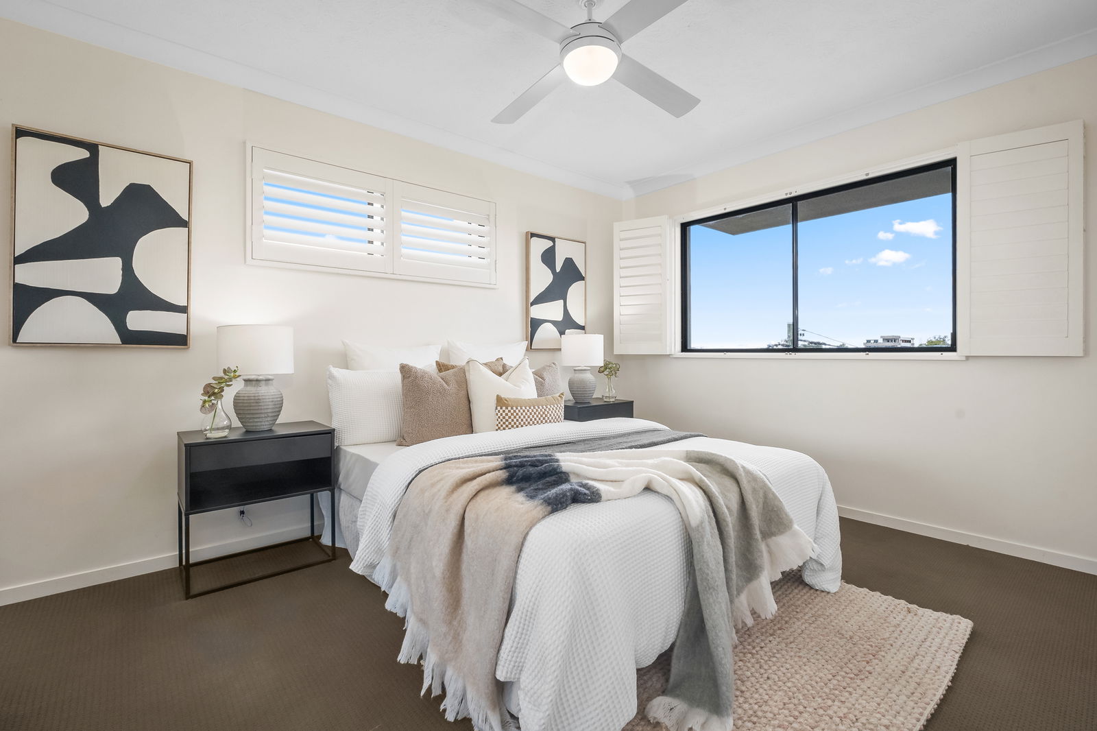 • Plantation shutters and neutral modern finishes