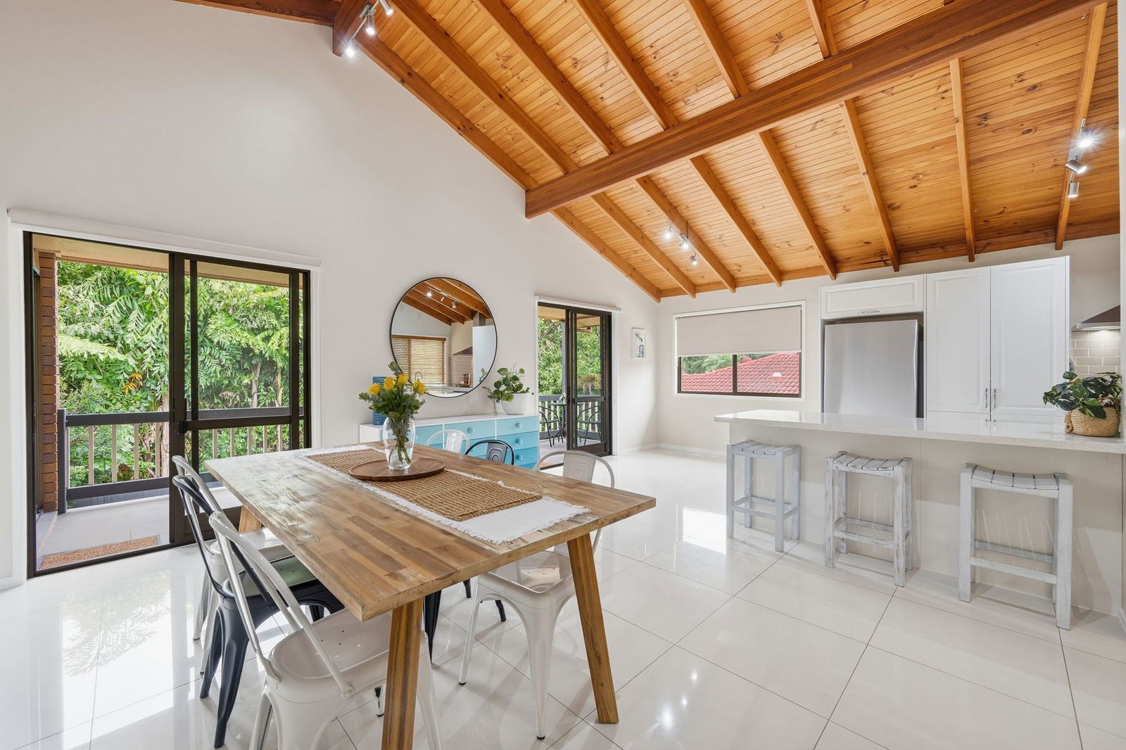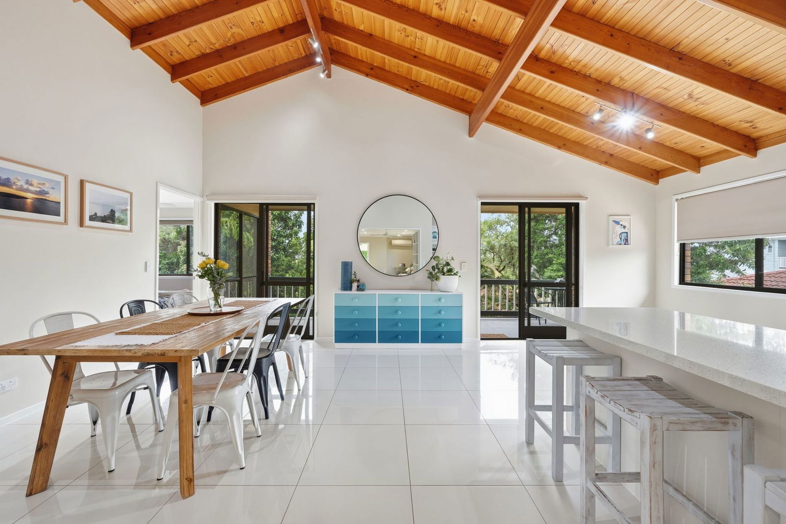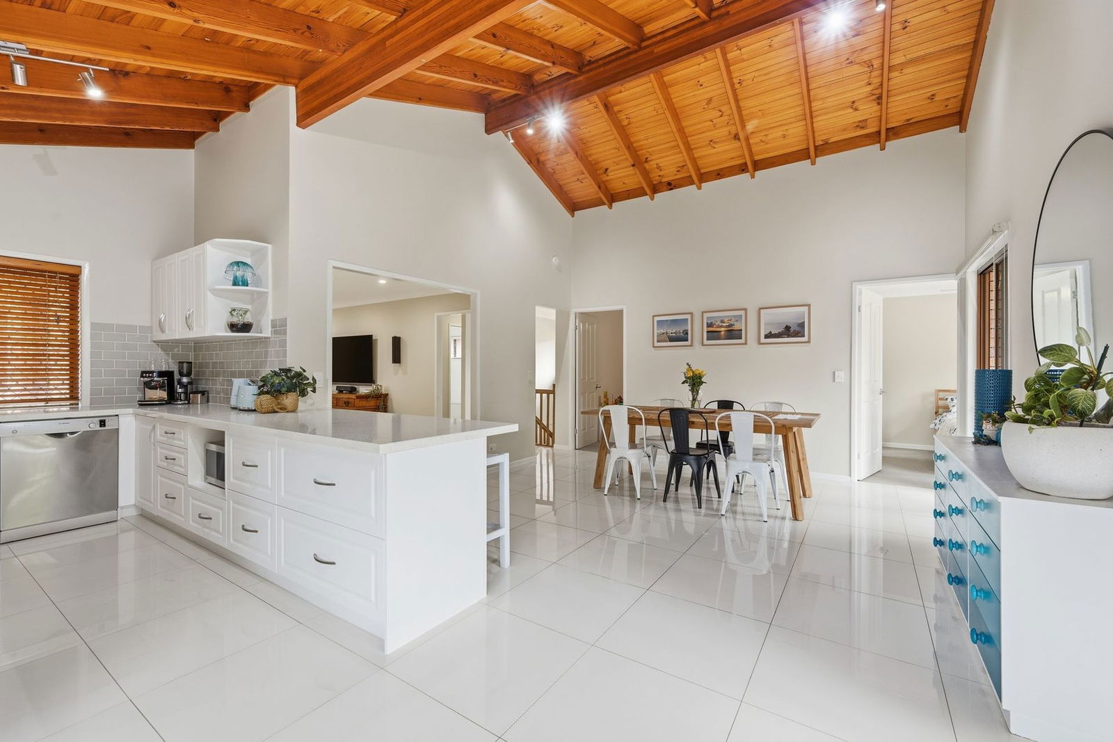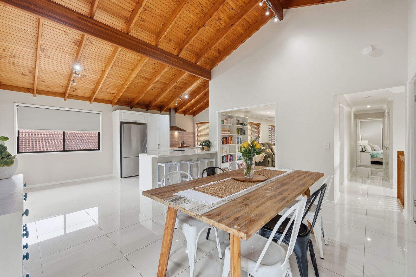 From the moment you step inside, you're welcomed by a light-filled living area showcasing large tile flooring and a welcoming, open atmosphere. The kitchen and dining area impress with soaring timber raked ceilings, enhancing both space and character, before flowing seamlessly to the rear verandah, the perfect setting for relaxed entertaining, summer barbecues and quiet afternoons. All bedrooms are generously proportioned and well-appointed with built-in robes, ceiling fans, and air conditioning to ensure year-round comfort.