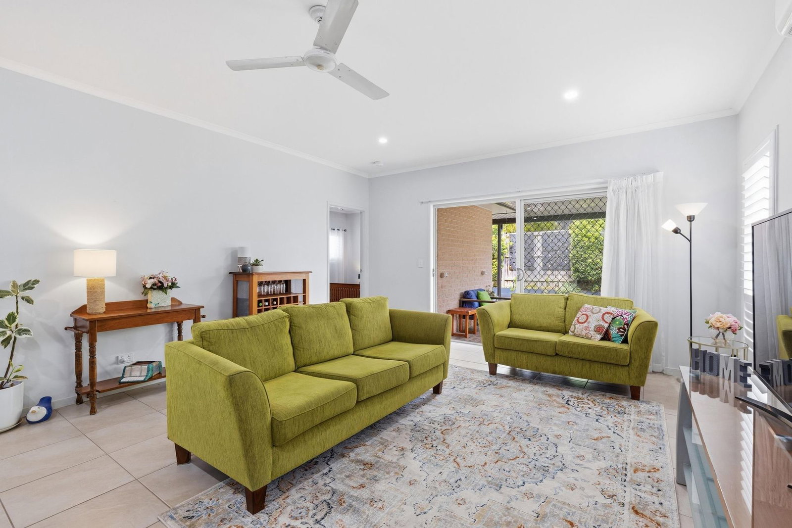 - Air-conditioned living and dining, flowing out to covered patio