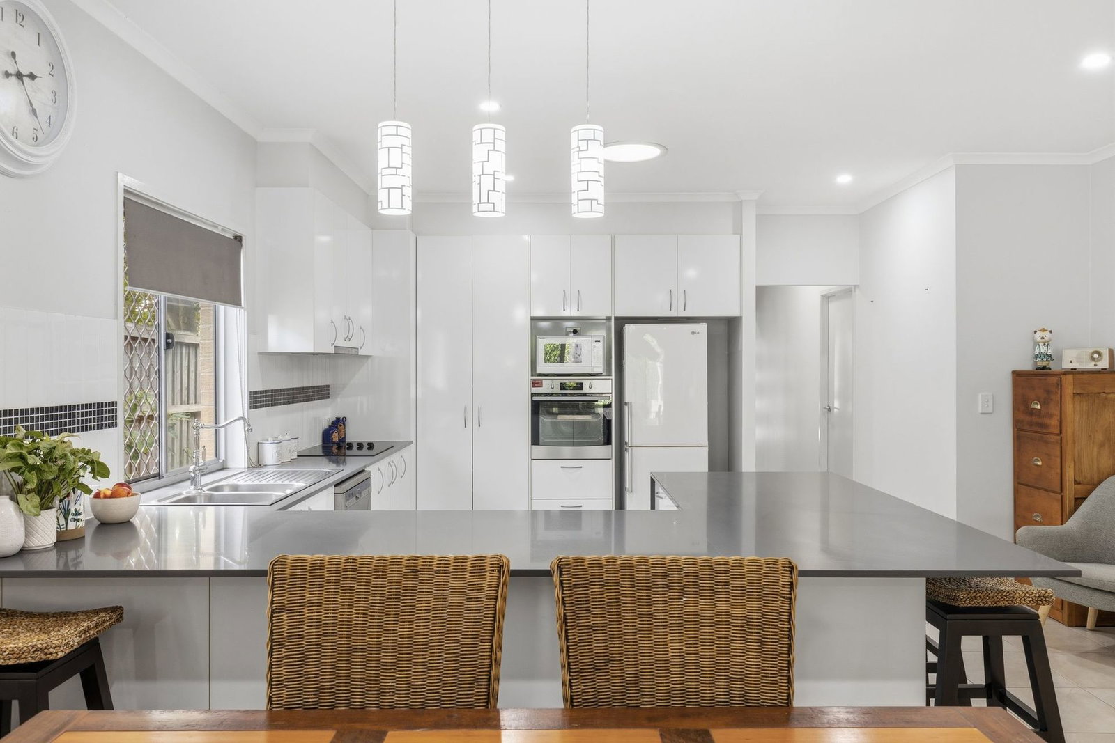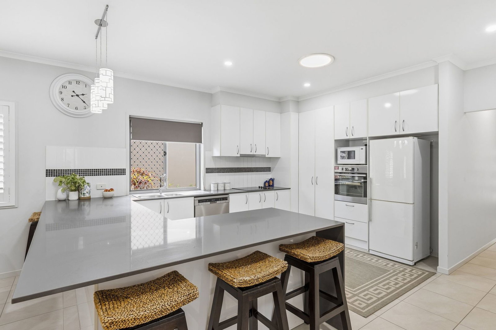 - Open plan kitchen with stone benchtops, breakfast bar, ample storage and dishwasher