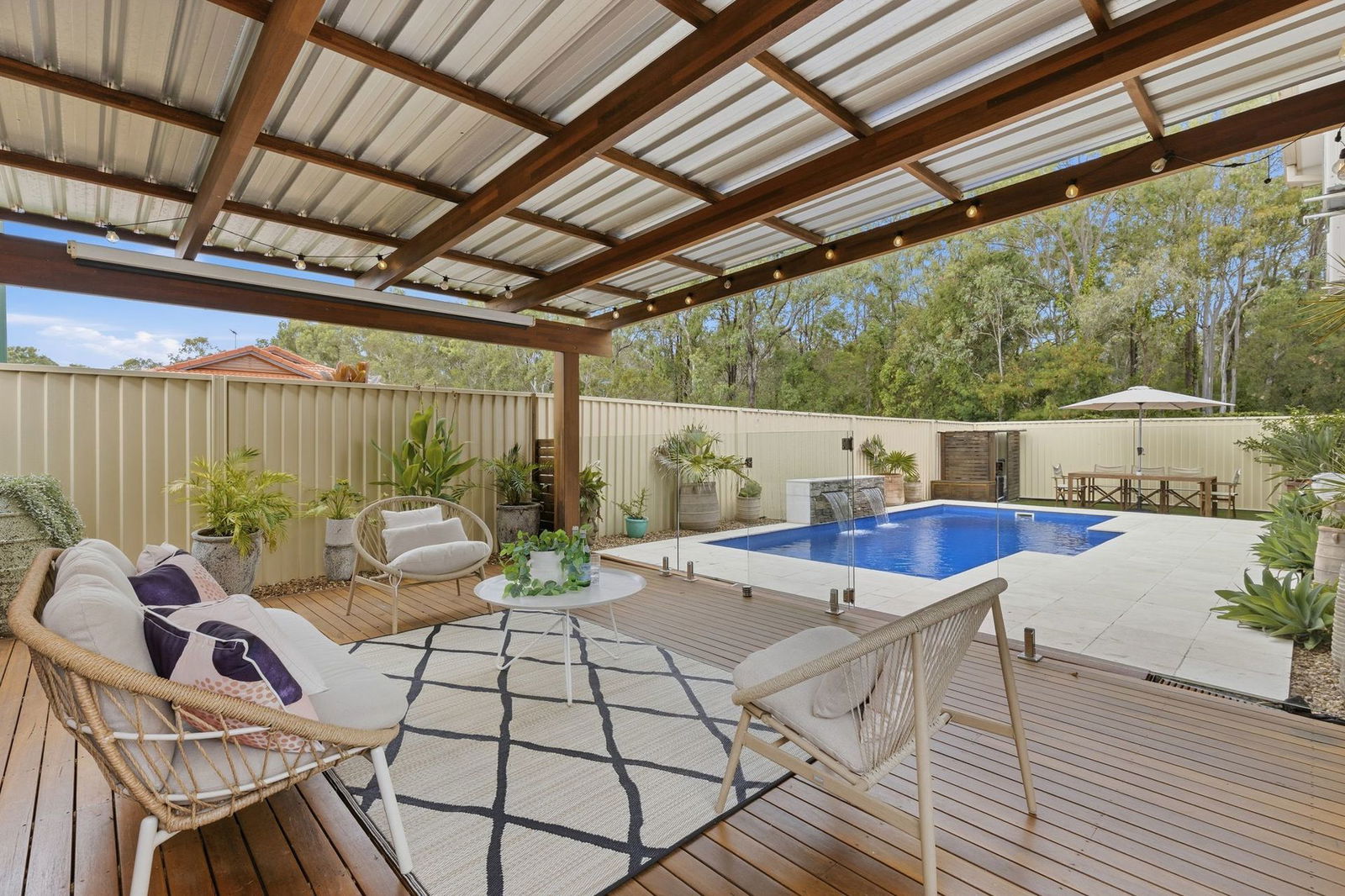 - Large covered entertainment area overlooking the heated inground pool with water feature and spa jets