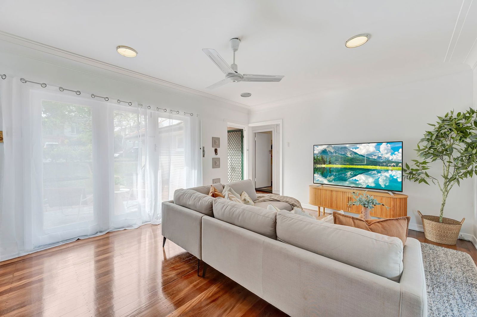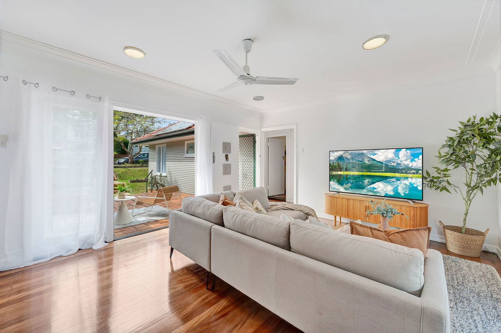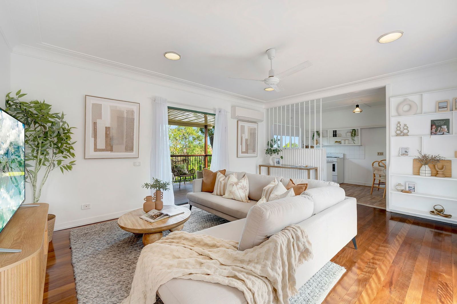 - Open plan living room with air conditioning with access to front and back entertaining areas