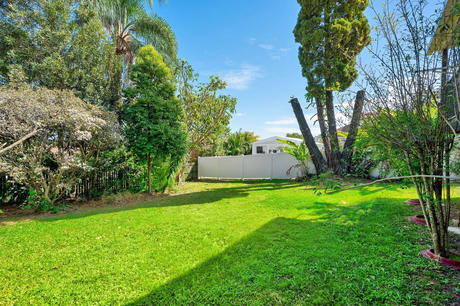 - Large backyard with established gardens