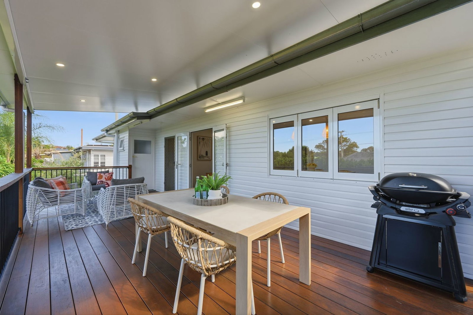 - French doors opening out to the covered deck overlooking the backyard