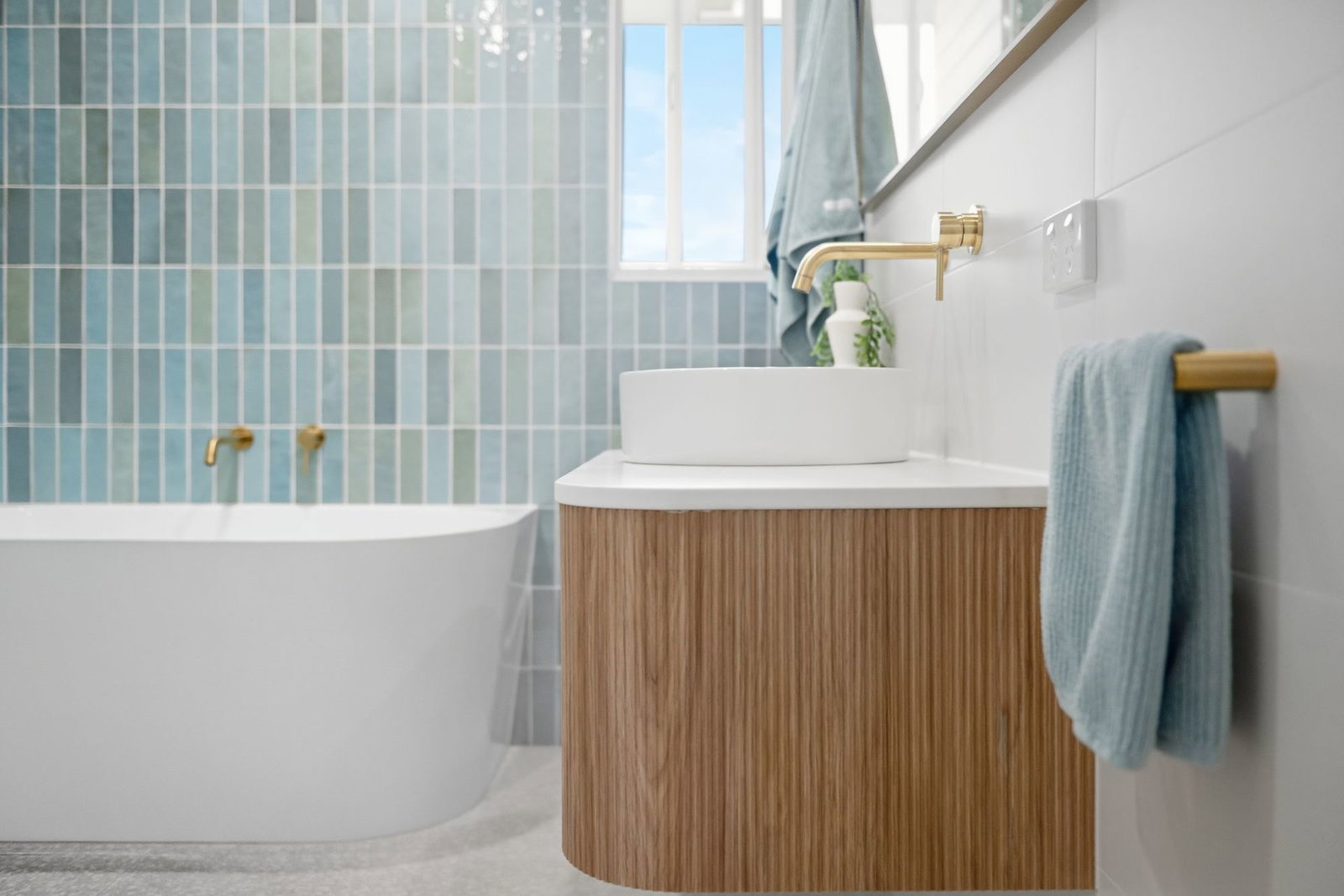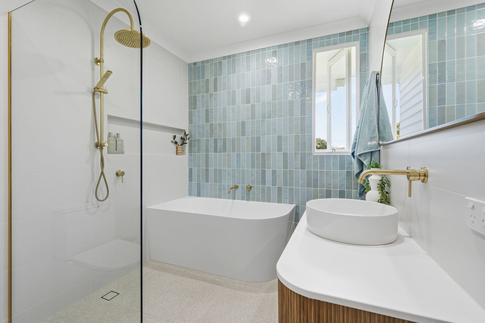 - Renovated bathroom with floor to ceiling tiles, separate bath, and second toilet