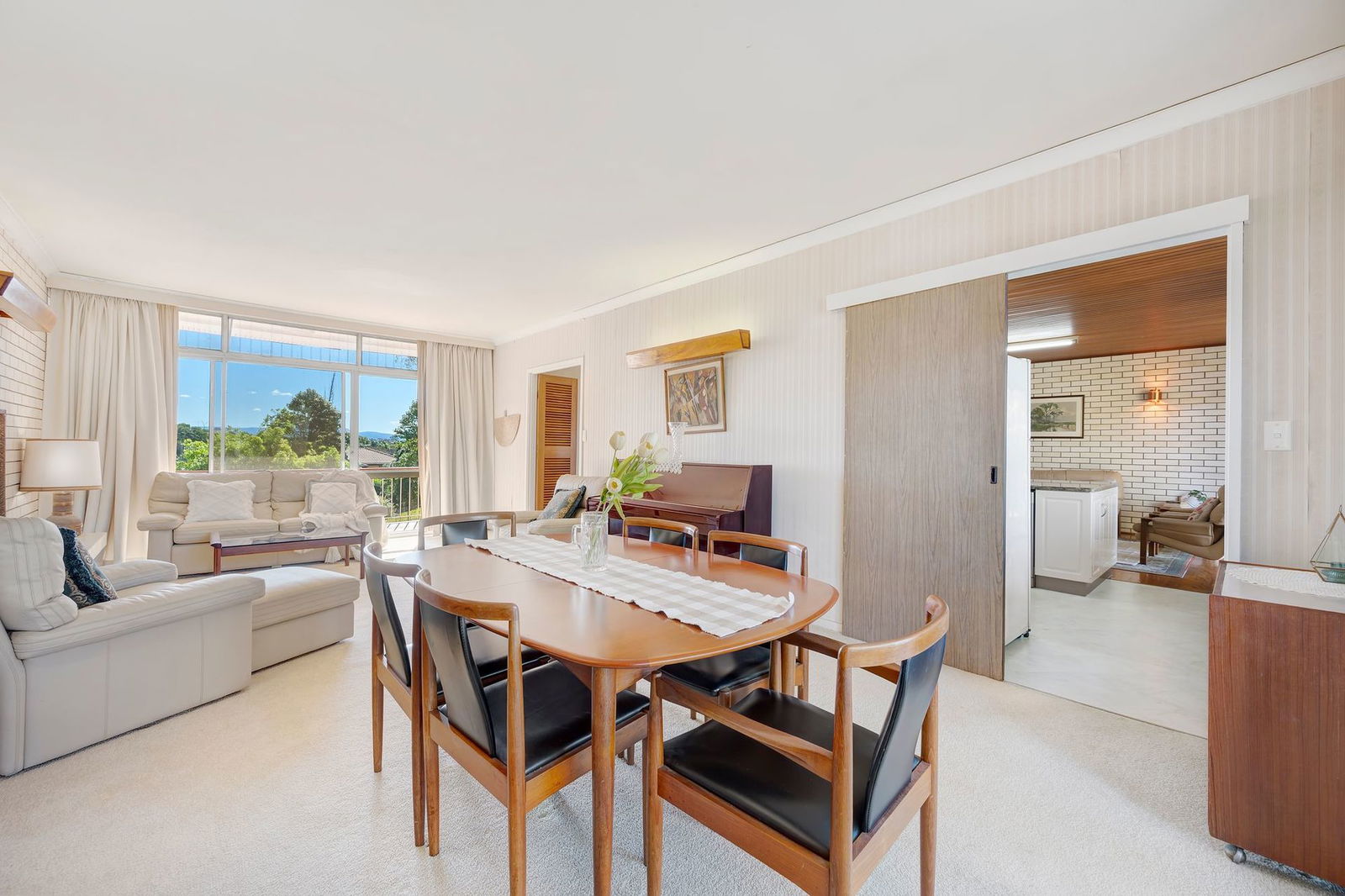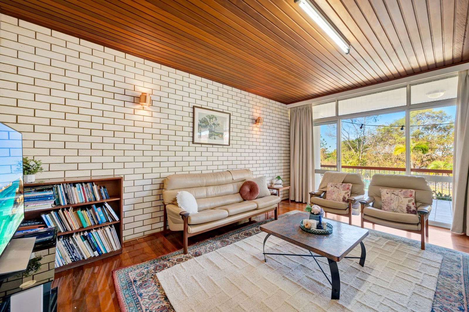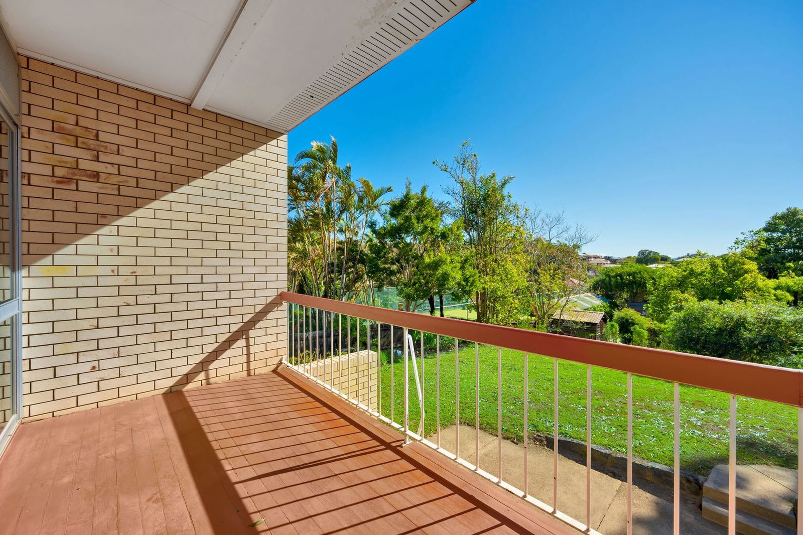 - Back deck flowing from living area, overlooking backyard with established greenery