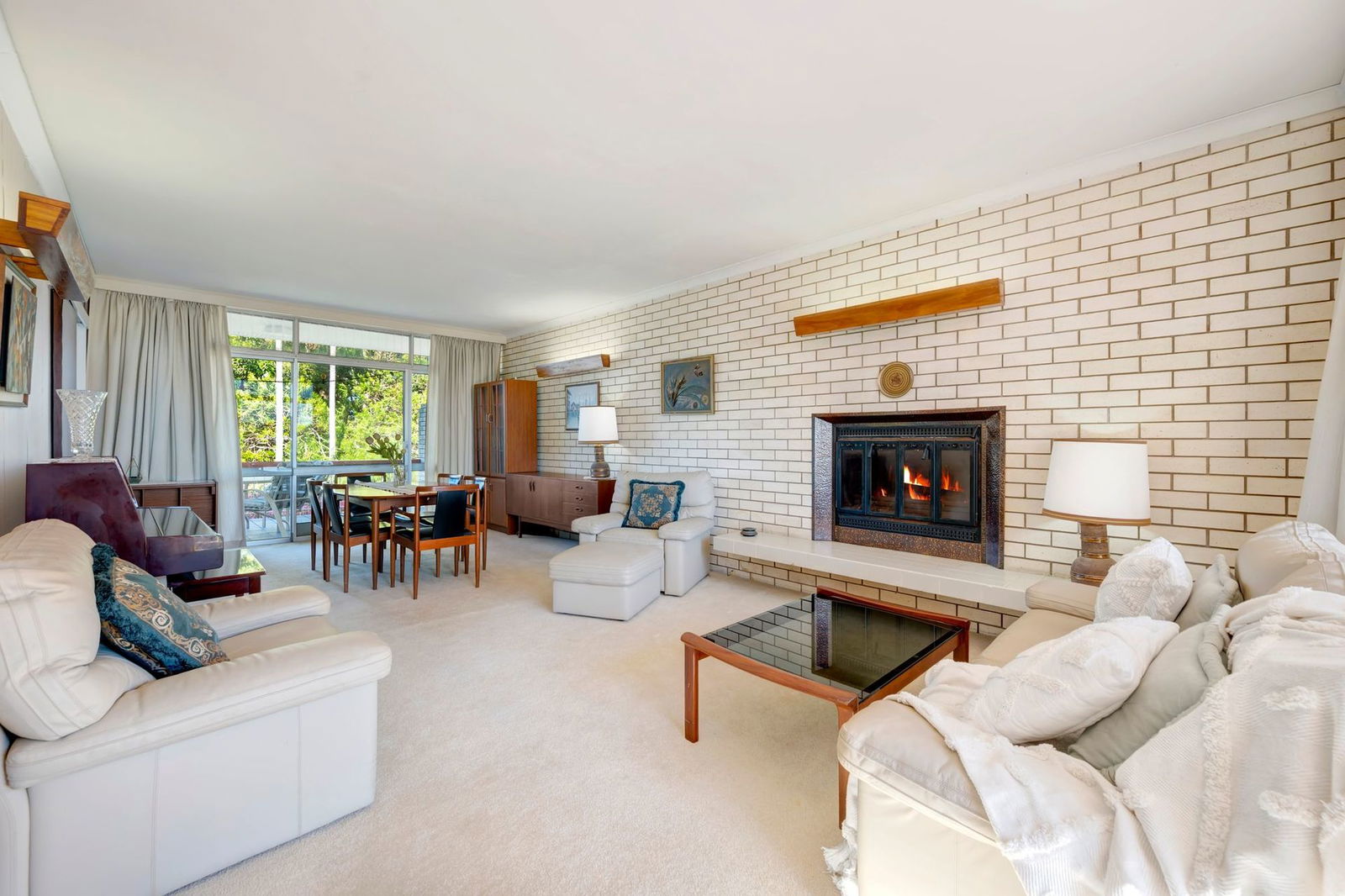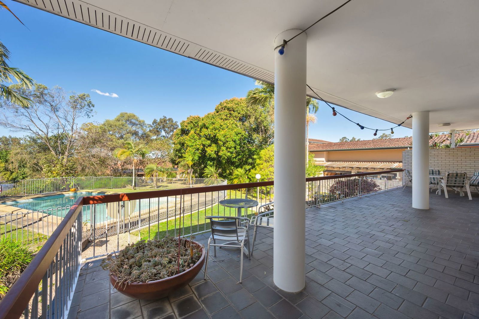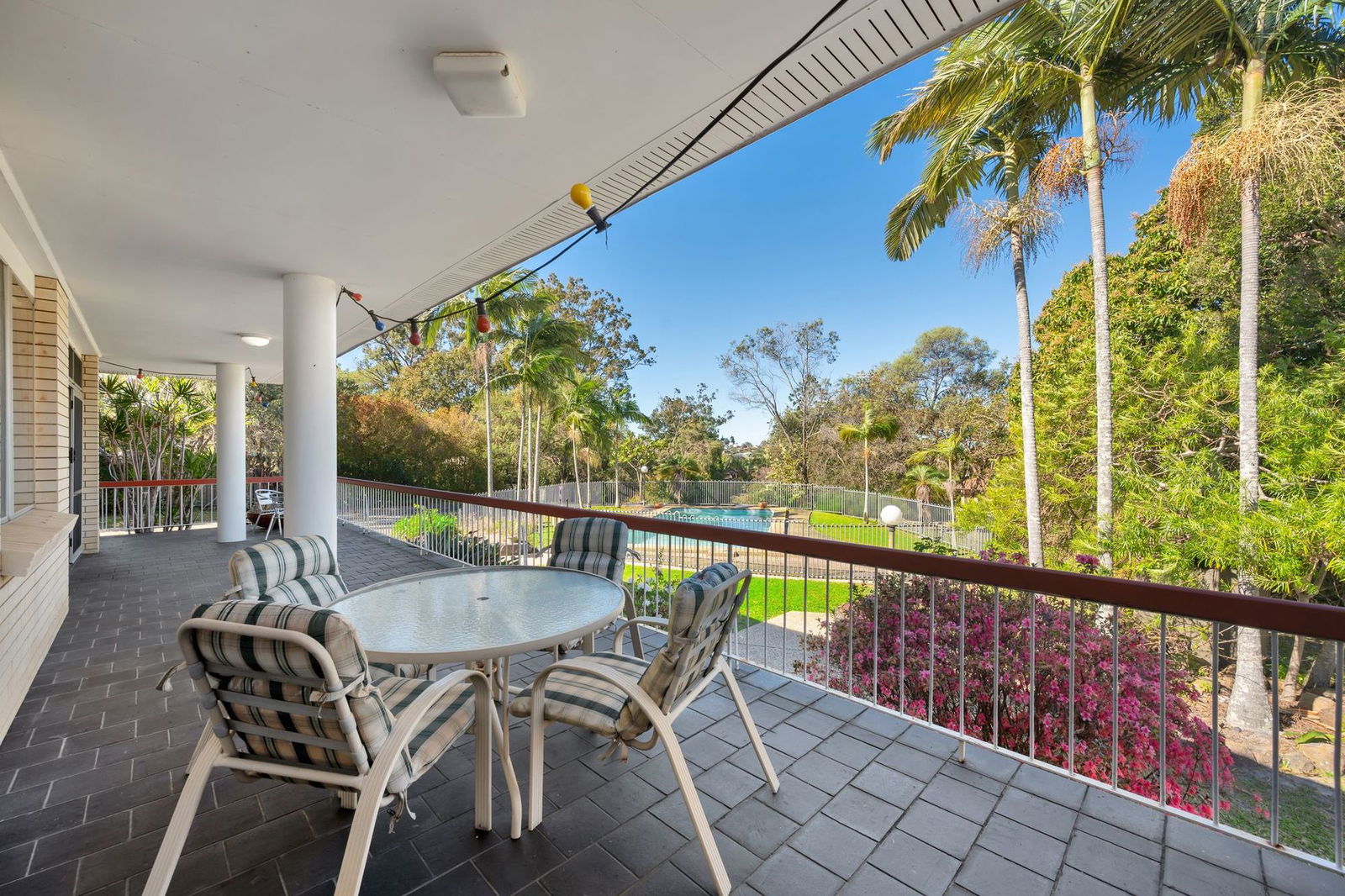 - Back deck flowing from living area, overlooking backyard with established greenery