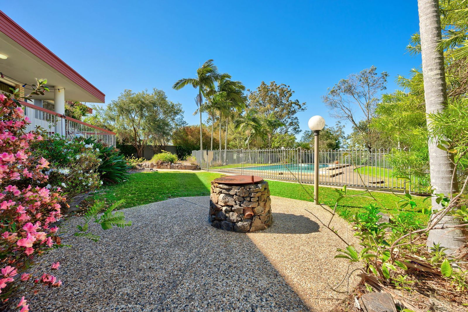 - Front deck overlooking in-ground swimming pool and fireplace