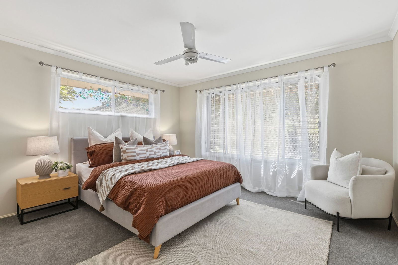 - Four bedrooms, all with built in wardrobes, ceiling fans and new carpet