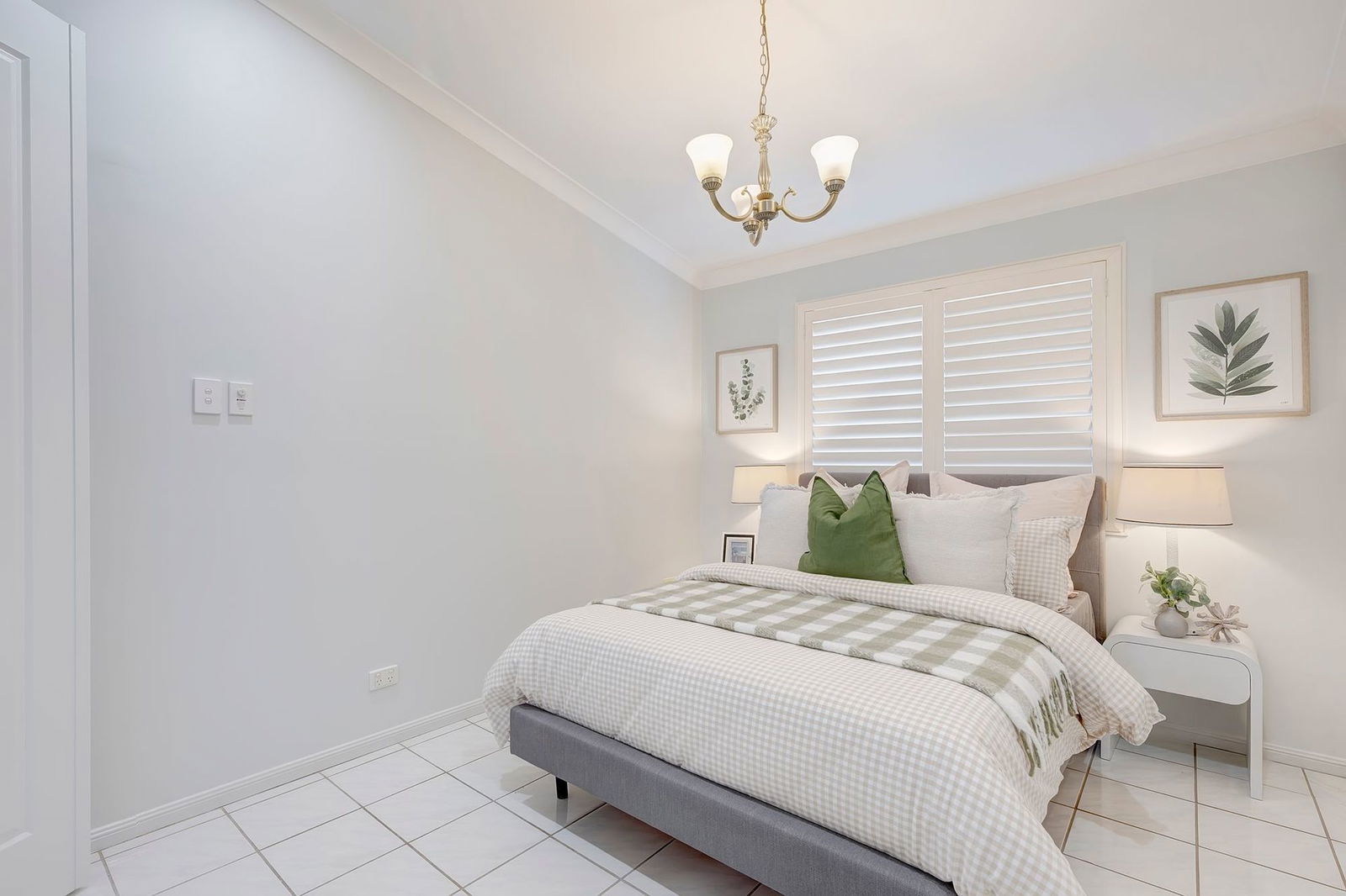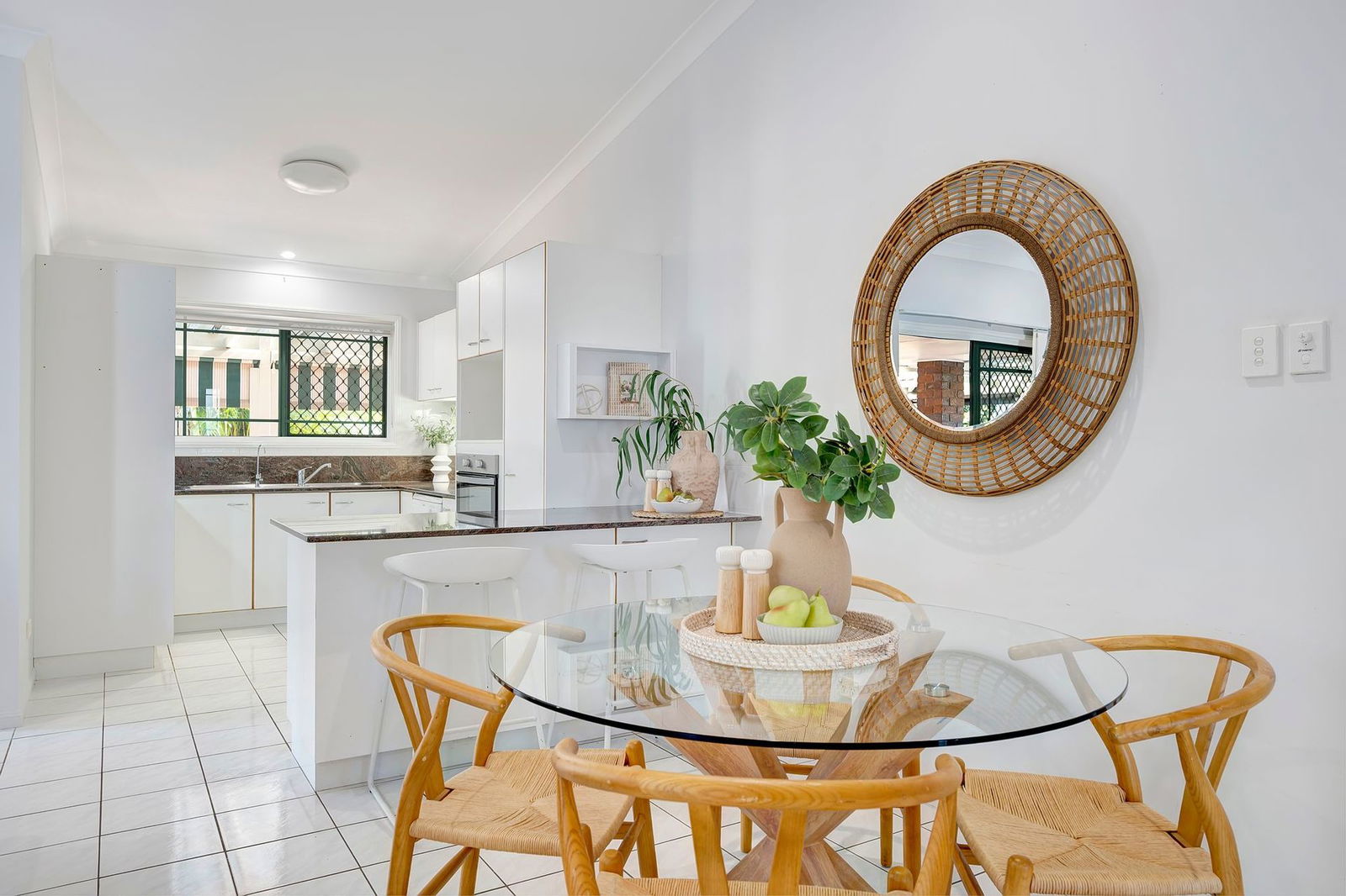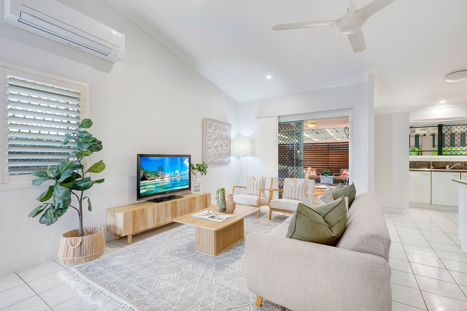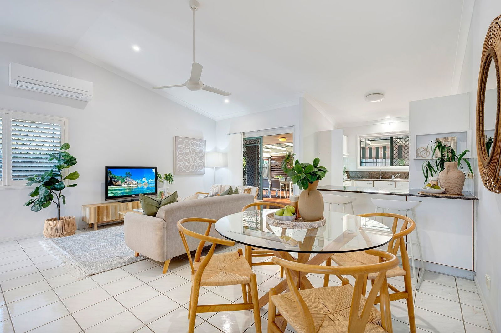 - Spacious air-conditioned living and dining area with high ceilings and plantation shutters