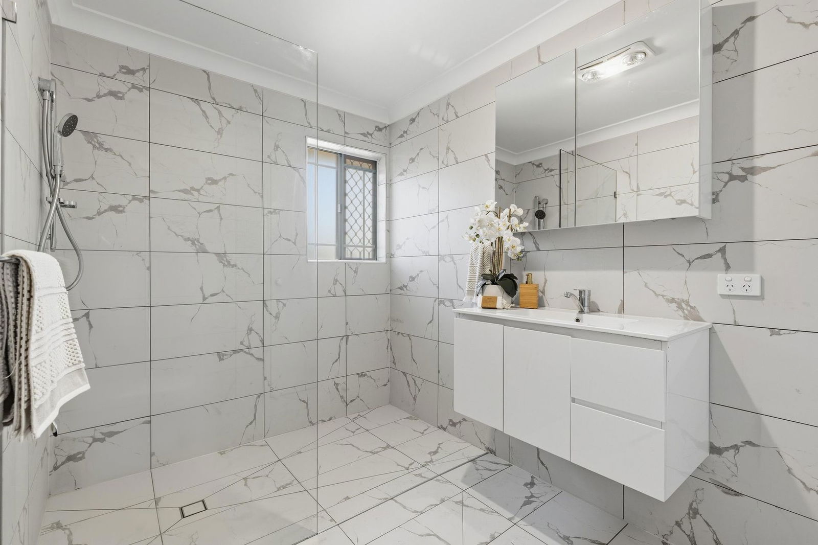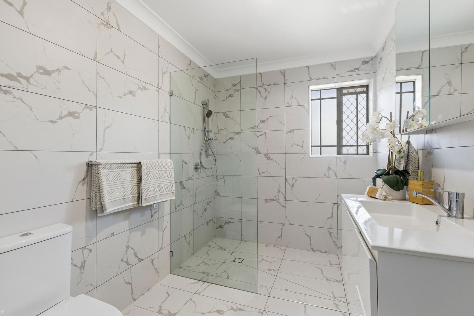 - New renovated bathroom with floor-to-ceiling tiles and walk in shower