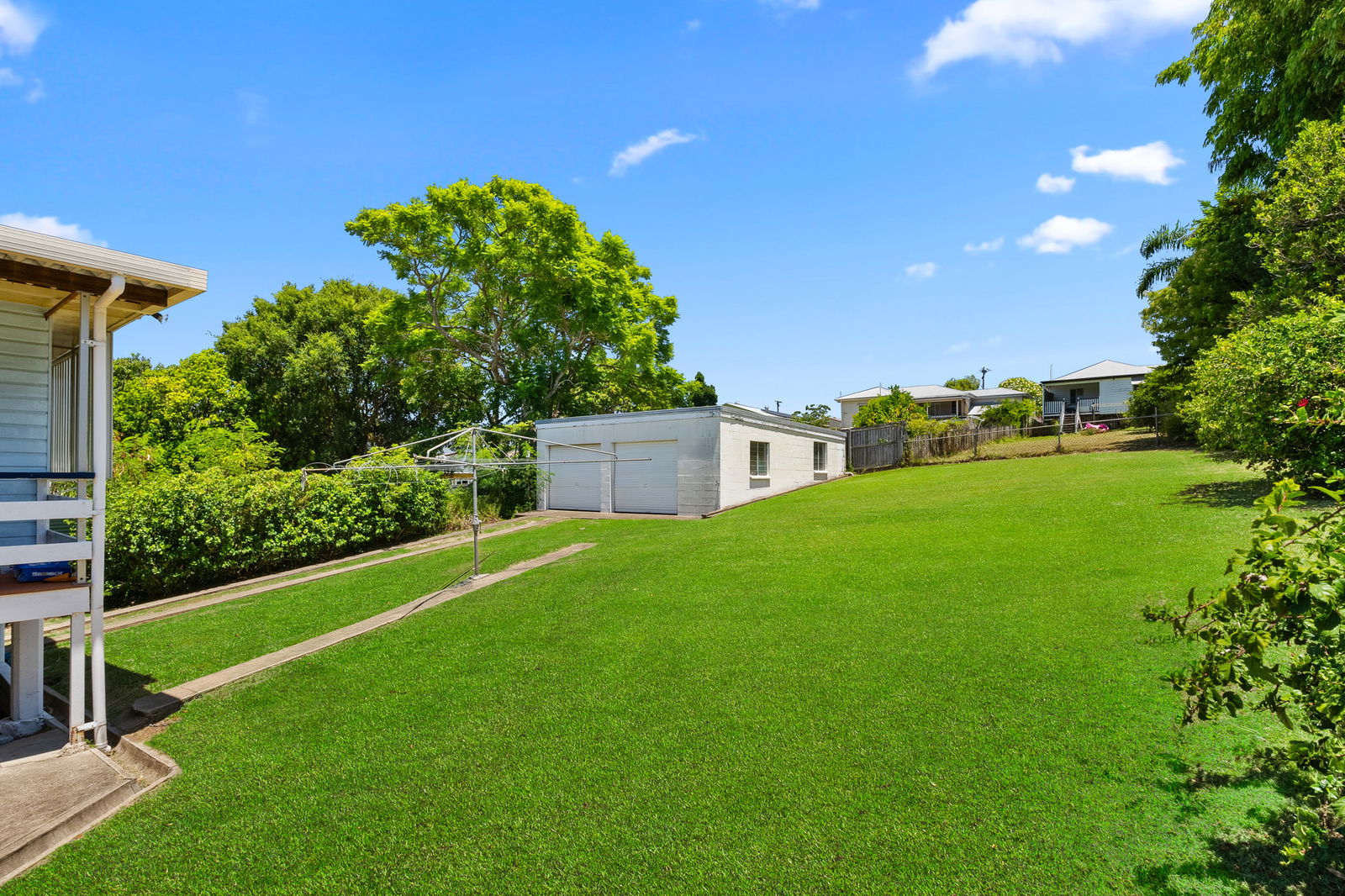 The expansive backyard includes a large freestanding shed with additional car accommodation or workshop space, while the under-house garage and storage enhance practicality.