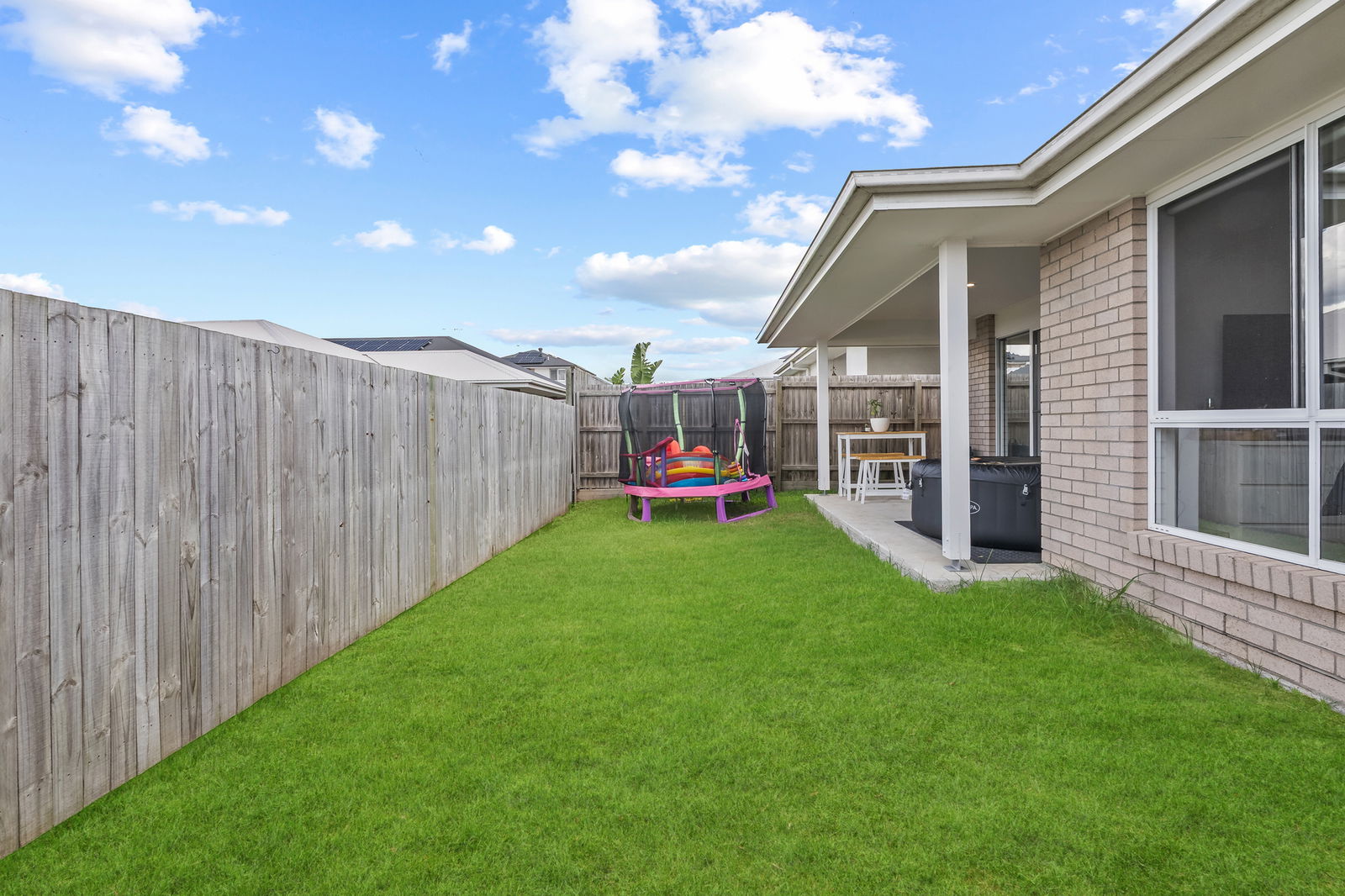 - Covered patio area that is perfect for relaxing and enjoying the sunshine, while the fully fenced backyard.