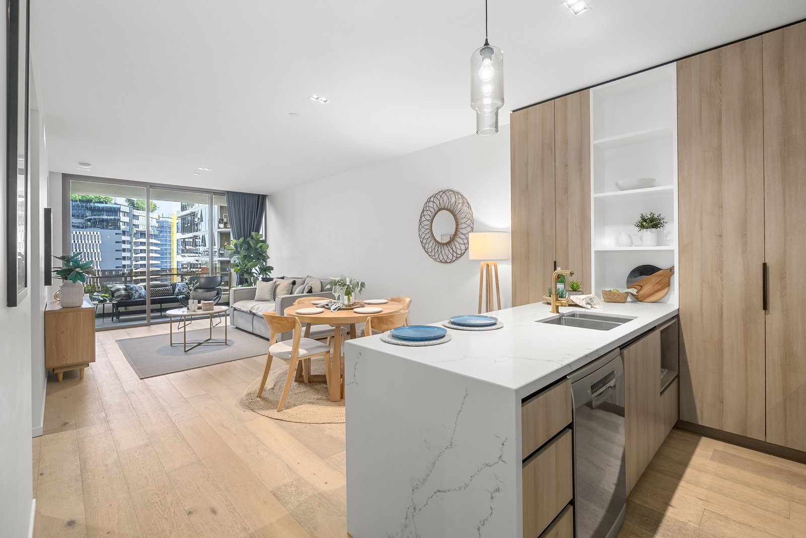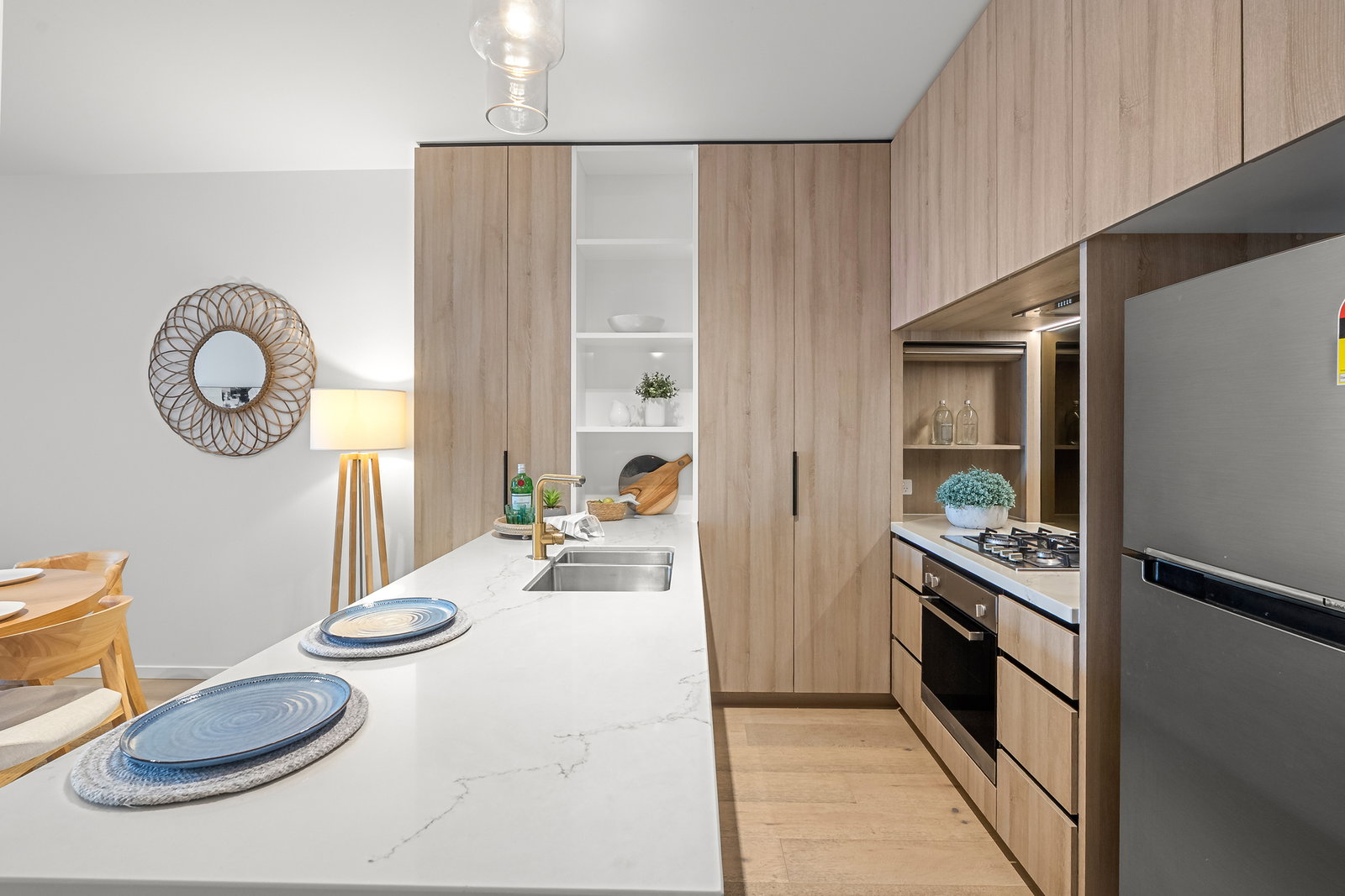 The designer kitchen is both stylish and practical, featuring premium European appliances, sleek finishes and full-height cabinetry. Flowing effortlessly from the living area, the oversized 22sqm wraparound balcony provides an ideal setting to host friends, relax with a morning coffee or unwind after a busy day.