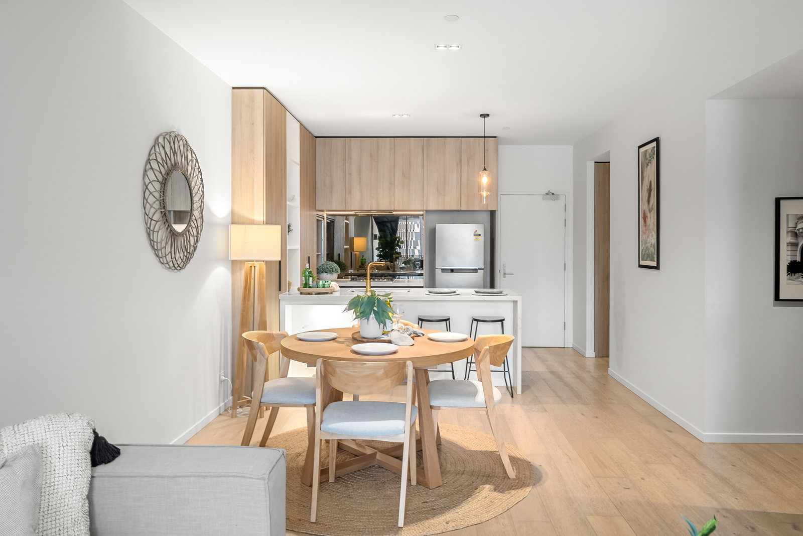 Bathed in natural light, this beautifully designed two-bedroom apartment offers a spacious and contemporary layout designed for comfort and functionality. Expansive glazing and a full-height stackable glass sliding door create a seamless transition between indoor and outdoor living, while the generous 2.7m ceilings enhance the sense of space and openness throughout.